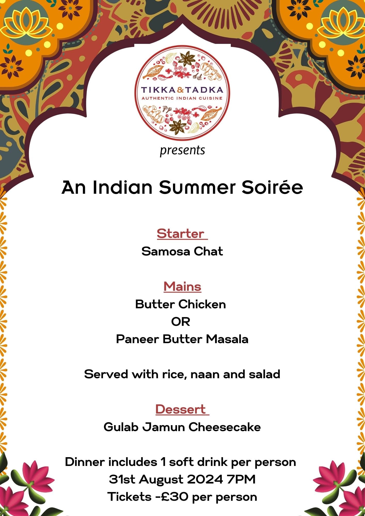 ????️ Featuring: A delicious three-course meal by the very talented Tikka and Tadka