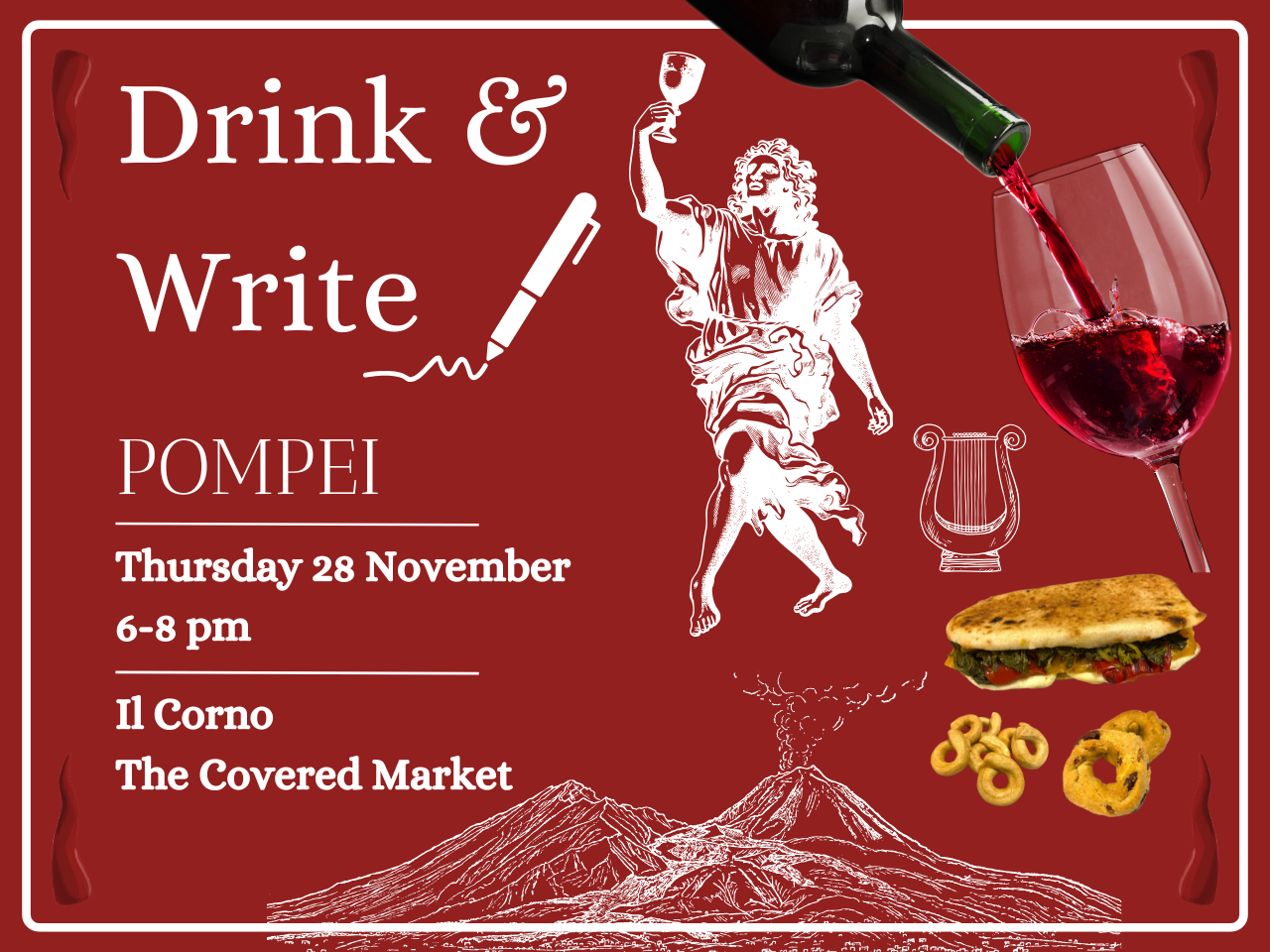For this session of our Drink and Write series we will be traveling back in time and precisely to Pompeii in 79 AD, right before the eruption of Mount Vesuvius, one of the deadliest of all time.