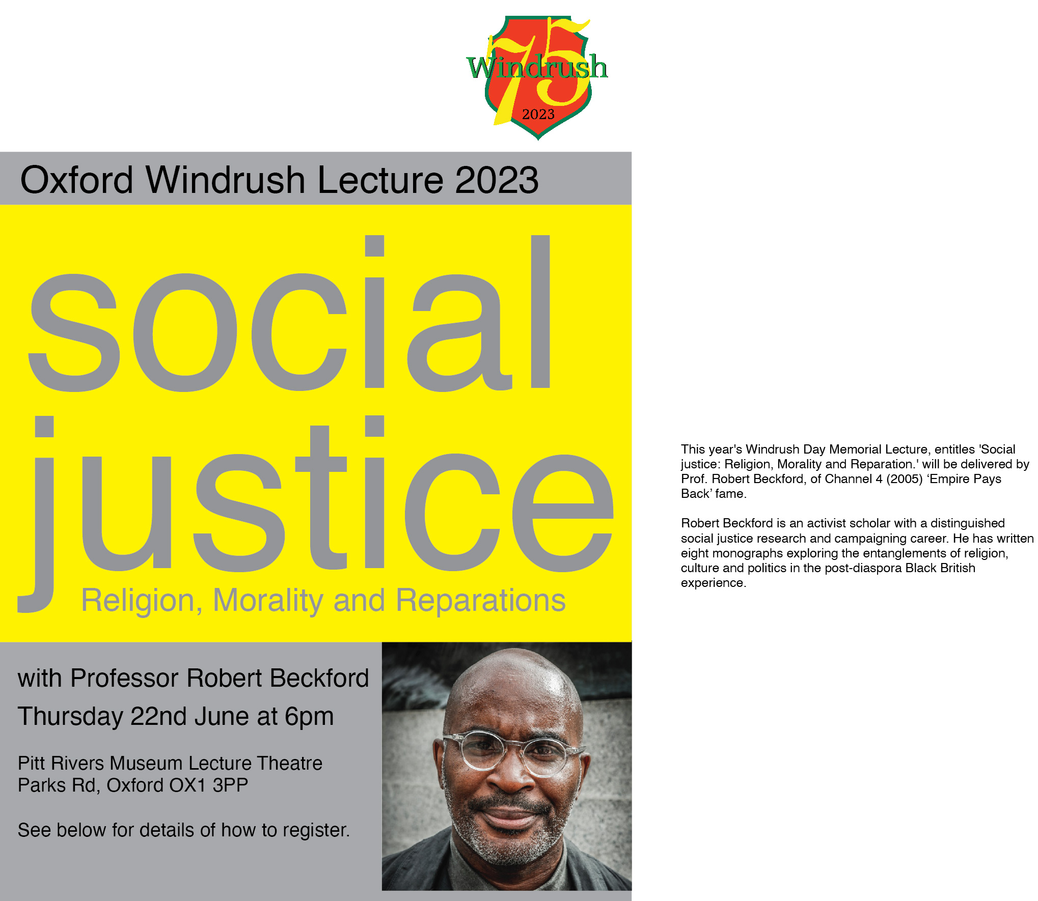 Join us for the Windrush Day Memorial Lecture featuring Prof. Robert Beckford, at Pitt Rivers Museum South Parks Road Oxford OX1 3PP.