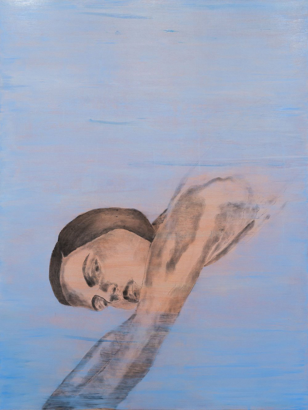 Rooted in an archival approach, with an appreciation of the rich potential of drawing, her work often begins with a figure from memory or a photograph. Each composition is poised, there is a sense of balance and reflection, a moment before or perhaps after an event. The softness of Zelga’s colour palette gives each piece a dreamlike impression, this aesthetic feels intensely feminine and is an opening into her enquiring mind. In the painting ‘Caught in your Current’ a figure emerges from a beautiful swirl of soft blues, worked into the surface grain of the wooden panel, the woman engages us directly, challenging our assumptions of her, she is here by her choice, vulnerable and yet strong.
